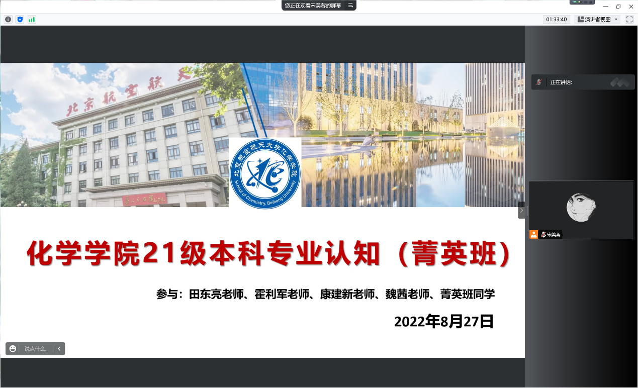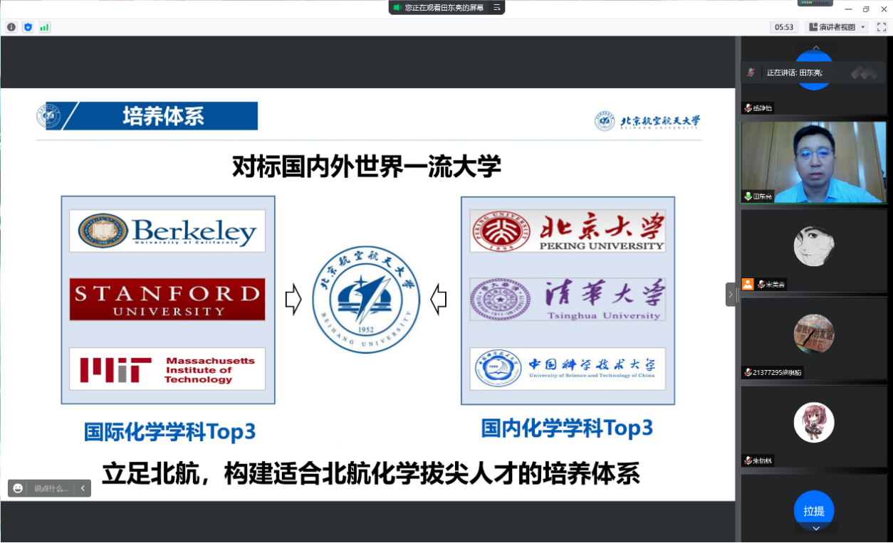 8月28日,今年会官网2021级菁英班开展系列专业认知教育活动。上午9:00,专业认知大会以腾讯会议的形式召开。本科教学副院长田东亮老师、化学生物学专业负责人霍利军老师、应用化学系康建新老师、院团委书记魏茜老师与菁英班全体同学参加了此次会议。