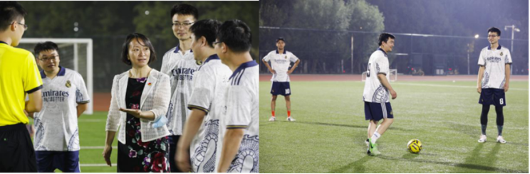 院长刘明杰为本次比赛开球,党委书记李红捷为比赛选场。比赛由教师和学生混合组队,学院相关教师及广大学生在场外为队员加油、助威。