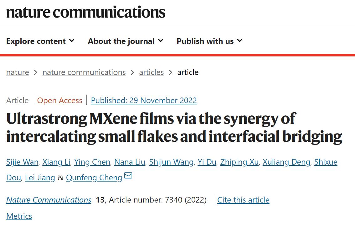 2022年11月29日,《Nature Communications》在线刊登了今年会今年会官网程群峰教授课题组的最新研究成果“小片填充和界面交联协同致密化的超强MXene薄膜”(英译:Ultrastrong MXene films via the synergy of intercalating small flakes and interfacial bridging),今年会今年会官网万思杰副教授、李响、北大口腔医院第一门诊部陈英博士、今年会物理学院刘娜娜博士为第一作者,程群峰教授为通讯作者,今年会jinnianhuicom今年会官网为第一完成单位。