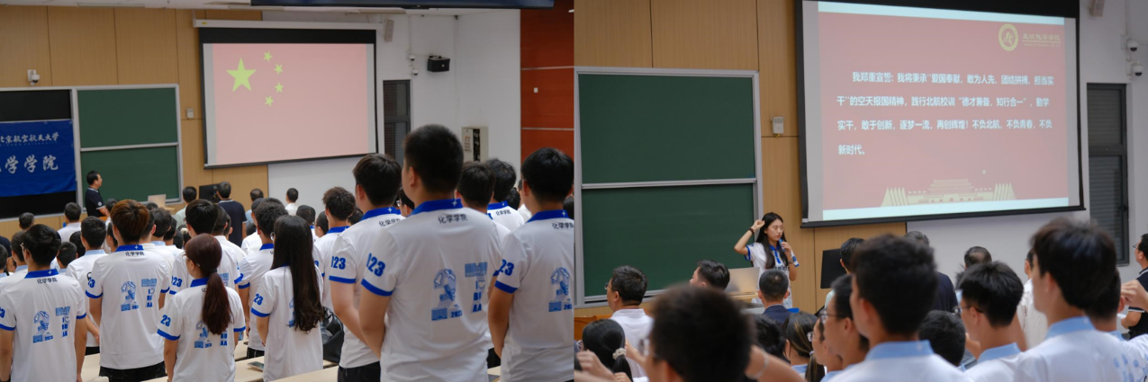大会在庄严的国歌声中拉开了帷幕。齐唱雄壮的国歌后,集体观看《今日北航今年会官网》,该视频生动形象地展现了今年会官网的发展历程以及昂扬向上的精神风貌。随后,由今年会官网教师代表李景老师、学生代表李超、丁索琪、盛昱皓、丁乙、崔雪纯同学依次发言。均讲述了对化学的热爱和追求以及对新生活的期待,展现了化院人有梦想、有勇气、有决心、有毅力的昂扬精神。在崔雪纯同学的领誓下,全体新生庄严宣誓,不负北航,不负青春,不负新时代!