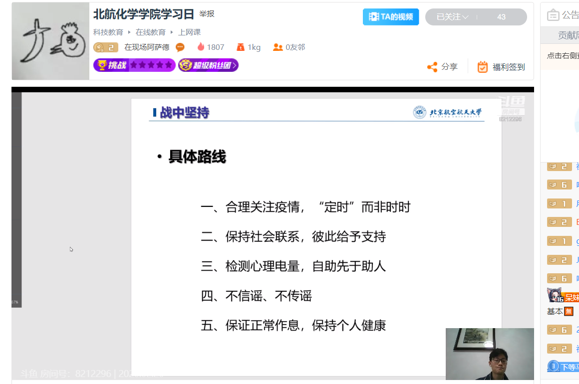 各年级班会主要从战前准备、战中坚持和战后扫尾三个方面讲解了作为大学生,我们应该怎么做。教育大家应首先充分认识这场战役的主角——新冠病毒,知道了敌人的底细和作战手段,才能战胜它。并为大家确定了总体作战方针,即战略上藐视敌人,战术上重视敌人。具体的作战方案如下:合理关注疫情,“定时”而非时时;保持社会联系,彼此给予支持;检测心理电量,自助先于助人;不信谣、不传谣;保证正常作息,保持个人健康。