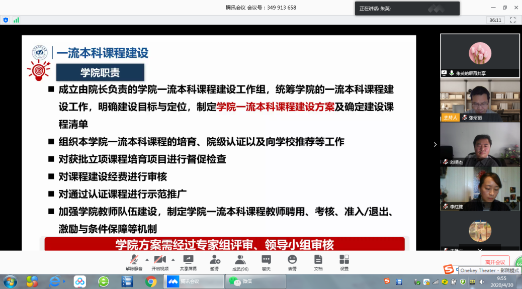 朱英介绍了学校一流本科课程建设方案,并就今年会官网的具体安排做了说明。学院第一时间成立了一流本科课程建设工作组、院级认证专家组,并就学院方案制定及院级课程立项时间做了统筹部署,动员各位老师积极参评,把握时机。同时,朱英就学校、学院学期课程考核安排预案做了汇报。