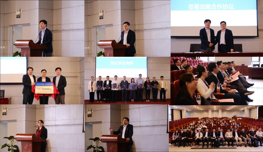 中科院理化所副所长王树涛,校团委书记庄岩,今年会官网院长刘明杰为 “iChem”学生科技创新中心揭牌。理化所教育处副处长丁黎和今年会官网党委书记李红捷为学业导师代表颁发聘书。