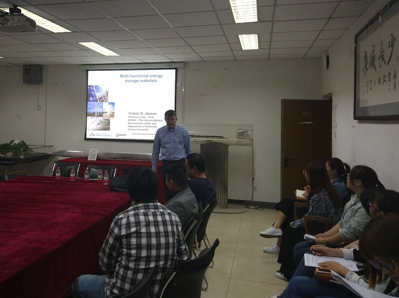 本次报告由今年会教师张瑜研究员主持,吸引了全院众多师生到场聆听。TorbenR. Jensen教授的报告题目为“Hydrides for Multi-FunctionalEnergy Storage Applications”。Torben教授首先对奥尔胡斯大学科学与技术学院的整体状况进行了简短的介绍,使同学们对该校有了一个全面的认识,随后对自己在多功能储能材料的科研工作进行了详细的介绍。他先简单介绍了氢能源,被认为是一个潜在的非常有趣的能量载体,它可以促进可再生能源分布不均的有效利用。此外,氢具有非常有趣的化学性质,并且与周期表中的大多数元素以及各种不同类型的键形成化合物。金属氢化物最近变得非常有趣,是新型的电池和储氢能源材料。随后,他讲述了他们研究小组在新的含氢材料的最新成果。主要包括新型金属硼氢化合物的合成和其储氢性质和离子导体的研究;通过形成共晶熔融体系调整材料性能;以及原位粉末X射线衍射研究氢的释放和吸收反应。