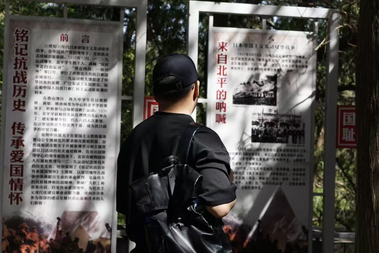支部党员沿樱桃沟步道攀登至纪念地。行至半途,“勿忘国耻,圆梦中华”的鲜红标语赫然映入眼帘,字字铿锵有力,仿佛跨越时空的呐喊,将抗战精神与新时代青年使命紧密相连。在庄严肃穆的“一二·九运动纪念亭”前,支部书记陈喆为支部党员讲述了“一二·九”运动时期的革命历史和意义。同学们结合展板图文,深刻学习了“一二·九”运动中爱国学生冲破封锁、唤起民众觉醒的历史细节。同学们长久驻足,透过泛黄的历史照片和详实文献,追忆北平学生抗日救国示威游行的壮烈场景。党员王力宏感慨:“题展里郭明秋等革命前辈组织领导爱国学生运动的事迹,让我深刻体会到战争年代,青年学子抛头颅洒热血;当代青年与新时代同向同行,肩负民族复兴重任,我们应牢记嘱托实干笃行,牢记科技强国使命。”党支部书记陈喆表示:“作为理工科研究生,我们既要传承‘科学救国’的历史基因,更要培育‘科技报国’的时代担当。”