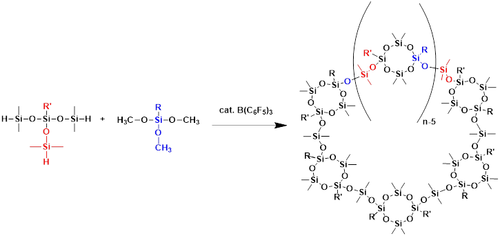 近年来,随着高分子合成领域的不断研究与发展,将含有张力的环四硅氧烷结构嵌入高分子化合物中已经被证实是合成多种功能材料诸如薄膜电解质、自修复材料、热稳定材料、高透氧膜、扩散剂、液晶等材料的重要手段。该课题组首次利用Piers-Rubinsztajn反应从简单的有机硅烷单体中合成一系列环状聚合物,并通过多种分析检测手段来进行佐证。与此同时,首次证实了使用环状聚合物引导无机粒子自组装的可行性,也发现了第一个可溶于有机溶剂的环状金纳米颗粒组装体。