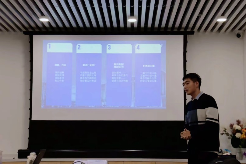 最后,聂导给大家带来《启航学堂》中的“我的大学学习”相关内容。《启航学堂》上,结合期中考试,班上两位单科分数最高的同学任姿璇和丛明昊和大家分享了他们的学习方法,接着聂导给大家介绍了时间管理和压力调节的几种经典理论。最后聂导表示,希望大家通过今天的学习沙龙,能够认真分析过去两个月的学习中出现的问题,从别人的分享中有所收获,并针对自己的实际学习情况制定接下来的计划,努力为期末考试做好准备。