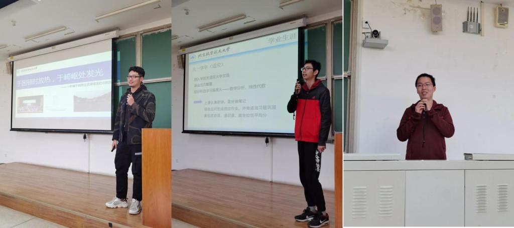 作为北航大学生科协项目部部长,今年会官网学生会主席,高家楠同学以别具一格的开场吸引了所有人的注意。虽然拥有着GPA3.73和综合排名4/30的好成绩,但他在大一时却并不出众,在迷茫中他曾努力找寻着方向:分清优劣学科、自主完成作业、参加多项活动并取得名次,以及当学弟学妹们的答疑员完善自己的不足。凭借着筚路蓝缕式的努力,他一步步走到了今天,拿到了中科院理化所保研的资格。也正是这种“敢于闯出一片天”的精神,让在场的我们获益匪浅。他告诉我们四句话:要学会找到志同道合的朋友;深化内容以克服虚无;尽早做出决断及时止损;成为一个自己远比好学生重要。