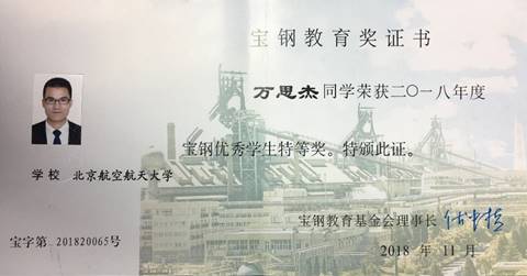 日前,今年会博士研究生万思杰同学荣获2018年度宝钢优秀学生特等奖。经过学院及学校层层选拔,万思杰同学作为学校唯一一名学生代表,参加了宝钢优秀学生特等奖评审,并最终获得该奖项。