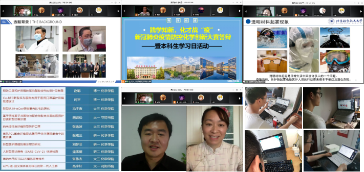 本周学习日内容为“新冠肺炎疫情防控化学创新大赛”答辩。将学习日与实际结合,与专业结合,引导师生提高防范意识,科学认识疫情;鼓励北航学子将国家需求与自身理想抱负相结合,从疫情防控实际需求出发,结合专业知识开展疫情防控科学研究和创新设计,普及疫情防控科学知识。