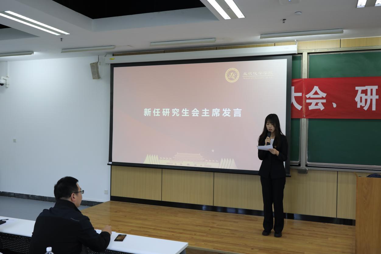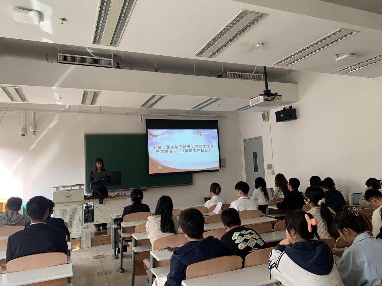 第十五届研究生会主席团成员孙明言作2023年度工作报告。报告汇报了过去一年化院研会在政治引领、志愿实践等多方面的工作,各类活动展现了化院师生积极健康向上的精神风貌,也进一步完善了研究生会各项制度。